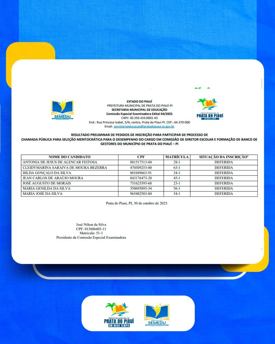A Prefeitura Municipal de Prata do Piauí, por meio da Secretaria Municipal de Educação (SEMEDU), divulga o resultado preliminar dos pedidos de inscrição para o processo seletivo referente à chamada pública para o cargo de Diretor Escolar e à formação do Banco de Gestores da rede municipal de ensino.