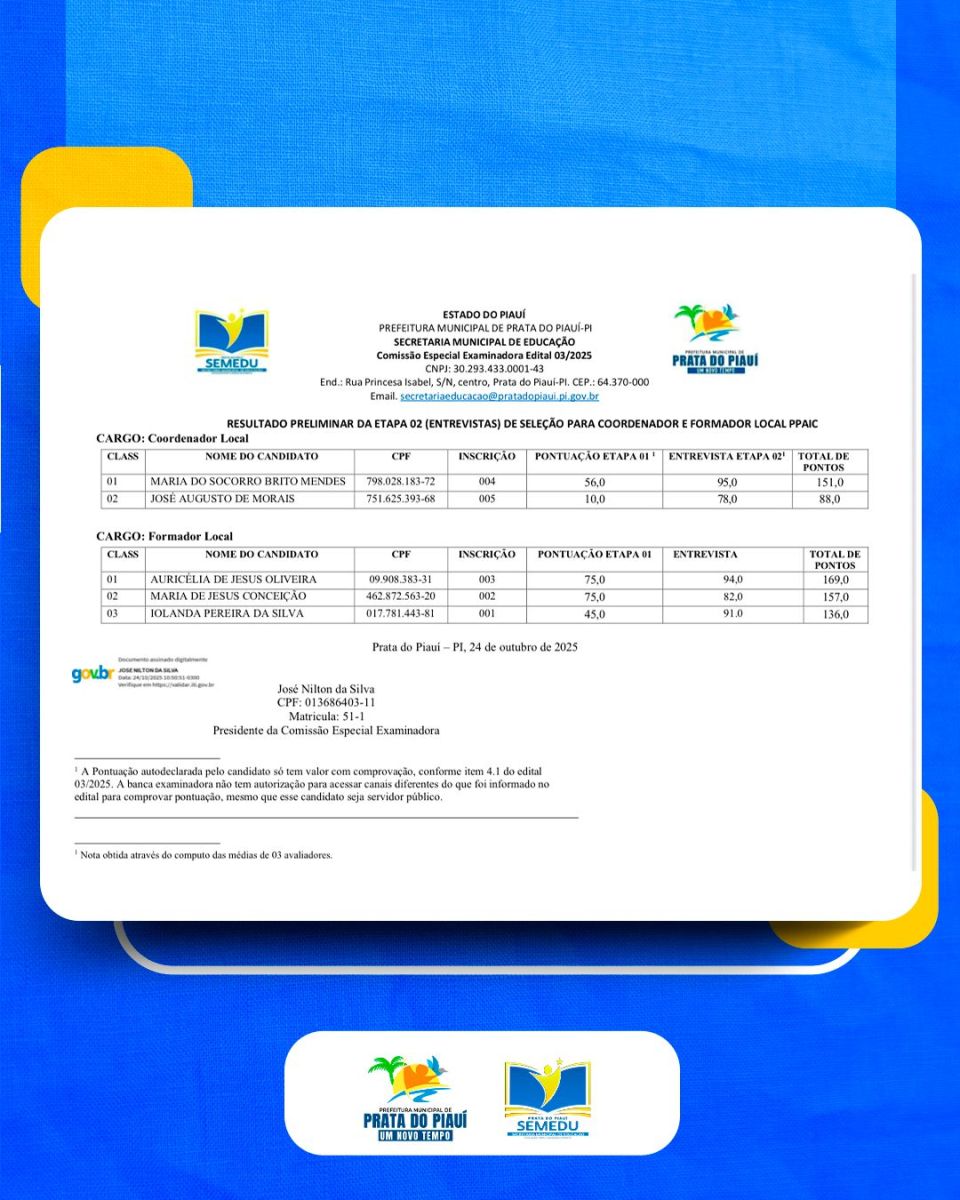 A Prefeitura de Prata do Piauí, por meio da Secretaria Municipal de Educação, torna público o resultado preliminar da Etapa 02 (entrevistas) do processo de seleção para Coordenador e Formador Local do PPAIC – Programa Piauiense de Alfabetização na Idade Certa.